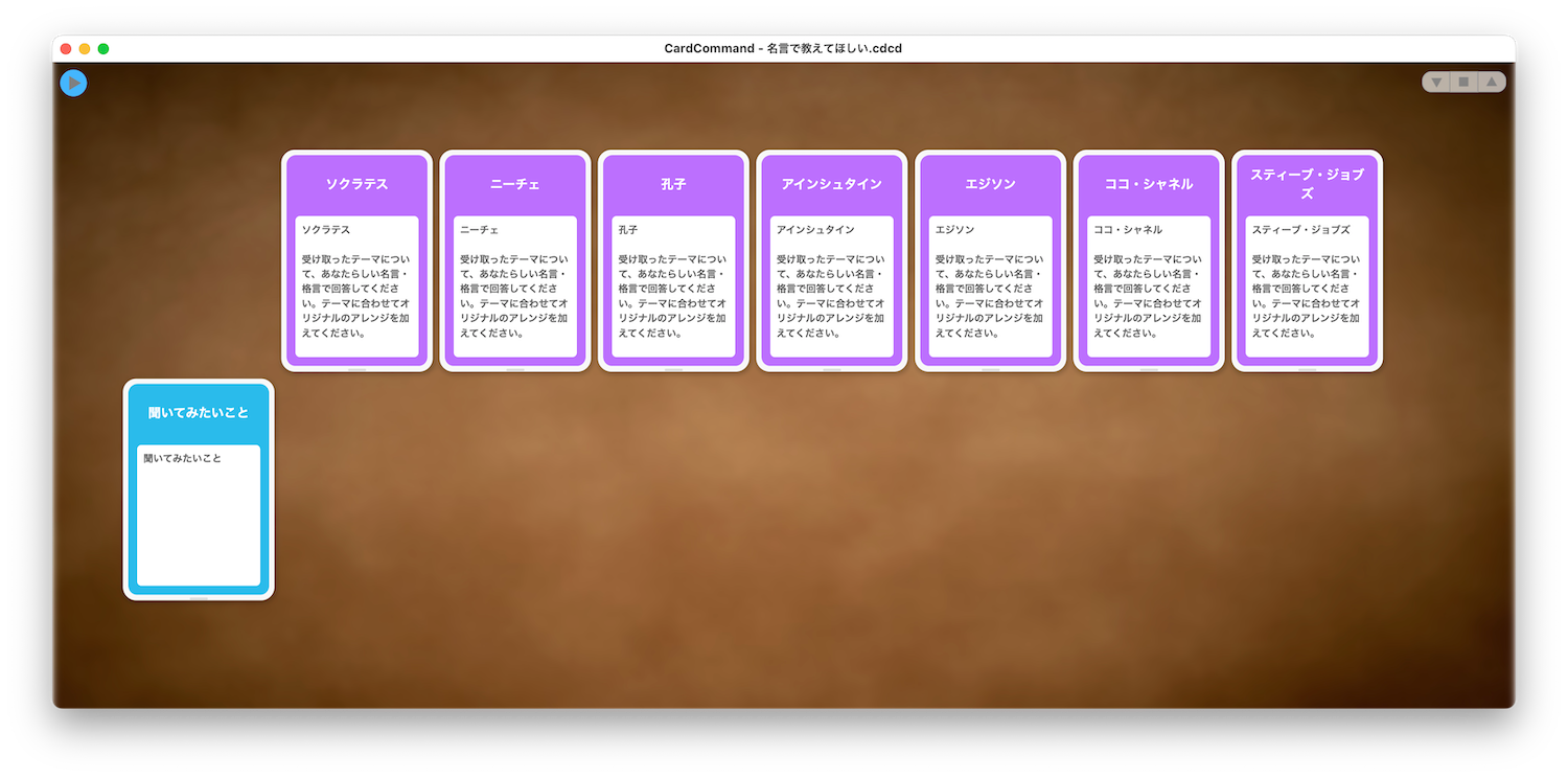 どんなことにも『名言』で教えてください 2025 12/04 数多くの名言を残した偉人たちが、あなたが聞きたいことに名言で答えてくれます。「聞きたいこと」カードに好きな質問を書いてください。【操作】コントロール画面→カードを連結→マトリックスモードで編集→AI FILLボタン 無料ダウンロード 戦略 よかったらシェアしてね! URLをコピーしました! 関連ファイル SNS投稿の切り口集 ビジネス書に聞いてみよう トレカでお試し(アナライザーカード入門) 答えはあの物語にあった 『SCAMPER』発想法でアイデアを拡げる 歴史が変わる!? 歴史人物お試しバトル