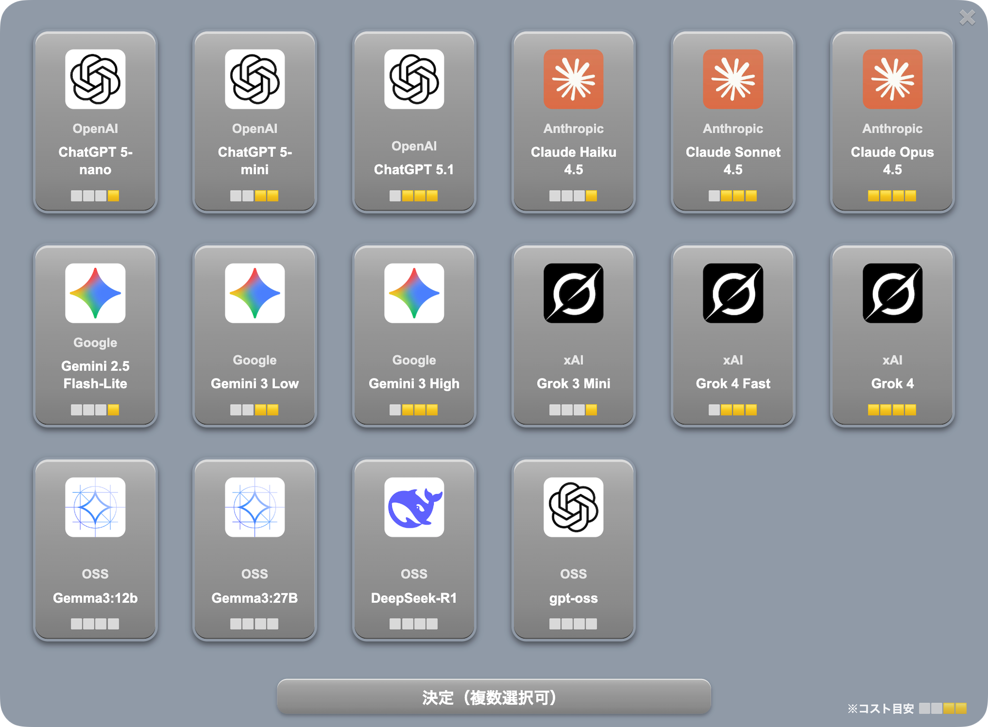・ChatGPT, Claude, Gemini, Grok のAPIキー(別途取得・複数同時使用OK)
